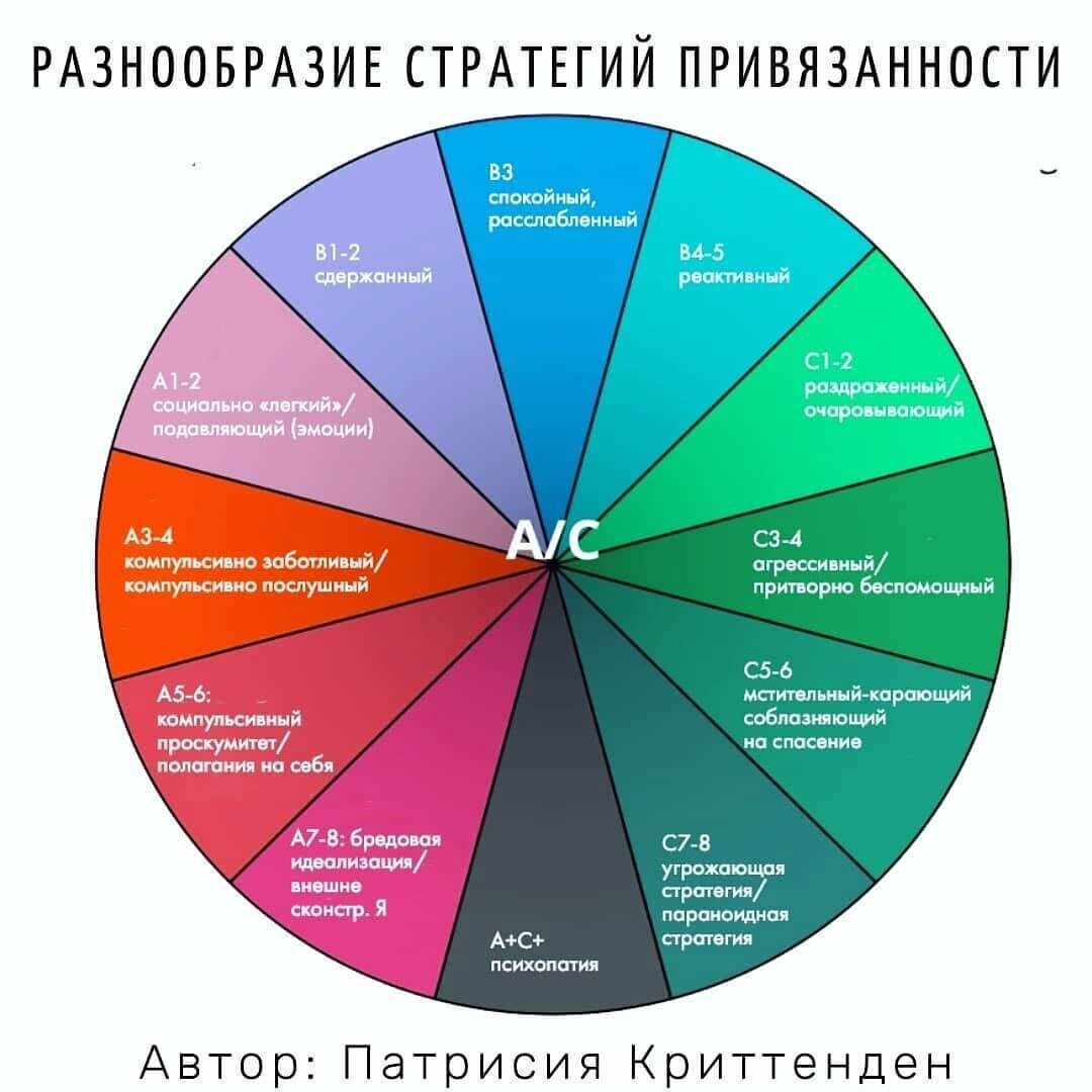 Взаимоотношения между ребенком и значимыми взрослыми формируют базовую стратегию поведения, которая впоследствии влияет на его жизнь. Специалисты выделяют 12 различных стратегий привязанности, из которых пять подходят под категорию относительной нормы. Среди них есть три разновидности безопасной привязанности и по одной — тревожной и избегающе-ориентированной (B1-3, C1-2, A1-2).