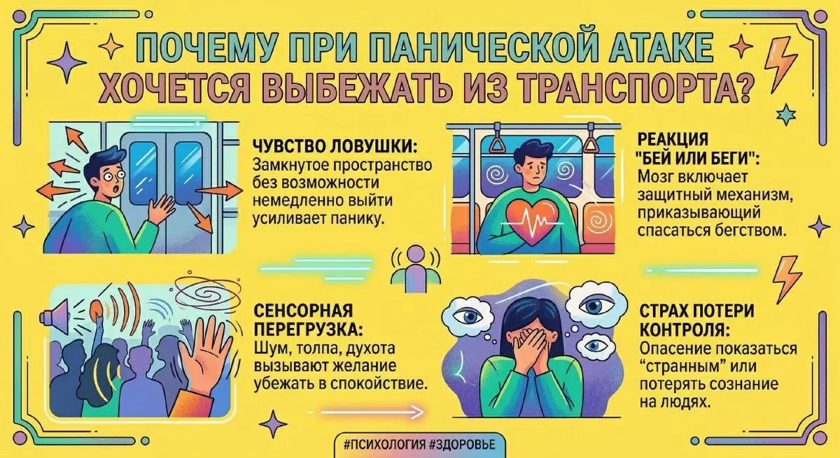 Когда в окружении есть преграды, выход которых затруднён — будь то метро или длинные очереди в торговых центрах, — мозг обостряет чувства: опасность + трудность выхода = невероятная паника. В таких местах, где трудно быстро выбраться, мозг начинает воспринимать их как ловушку. Если возникнет настоящая угроза, как можно будет покинуть данное пространство? Эта мысль подталкивает к инстинктивному желанию мгновенно переместиться в??ное место. Проблема в том, что в момент атаки невозможно четко определить, где это безопасное место. Это приводит к хаосу в действиях: на улице — попытка убежать в непонятном направлении, дома — бесцельные перемещения из комнаты в комнату.