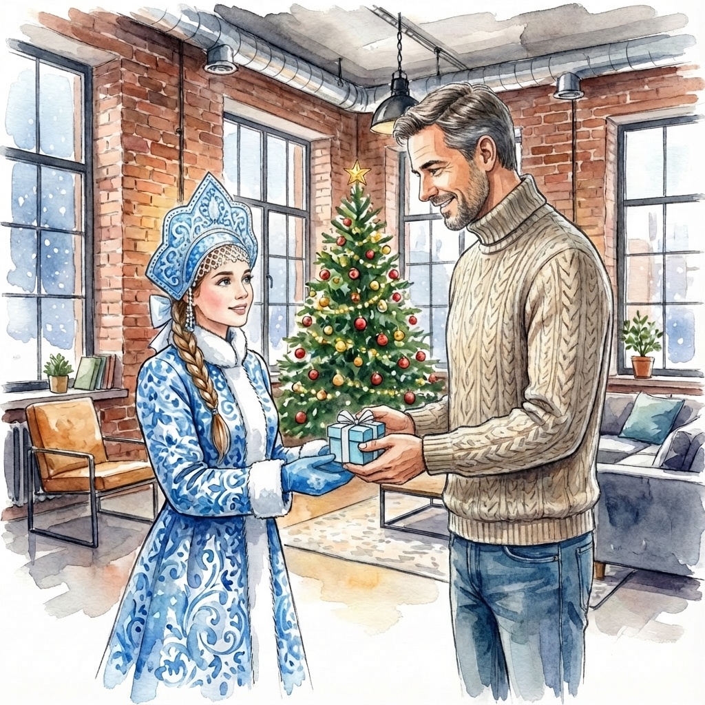 Прошло несколько часов ожидания, и, наконец, в дверь раздался долгожданный звонок. На пороге стояла Олеся в костюме Снегурочки, и, кажется, все новогодние мечты Максима сбылись. У неё был подготовлен подарок, в котором сочетались белоснежные новогодние узоры и теплотой дружбы.